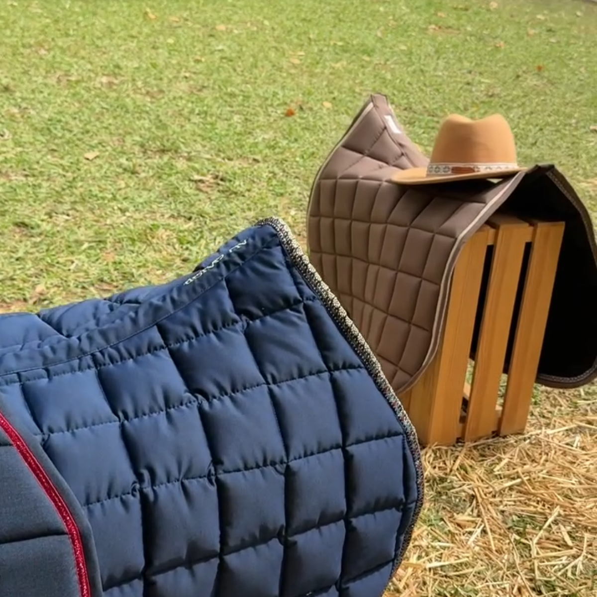 Sans motifs apparents, ces tapis misent sur la pureté des lignes, l’équilibre des couleurs et une esthétique sobre qui met en valeur le cheval sans détourner l’attention.